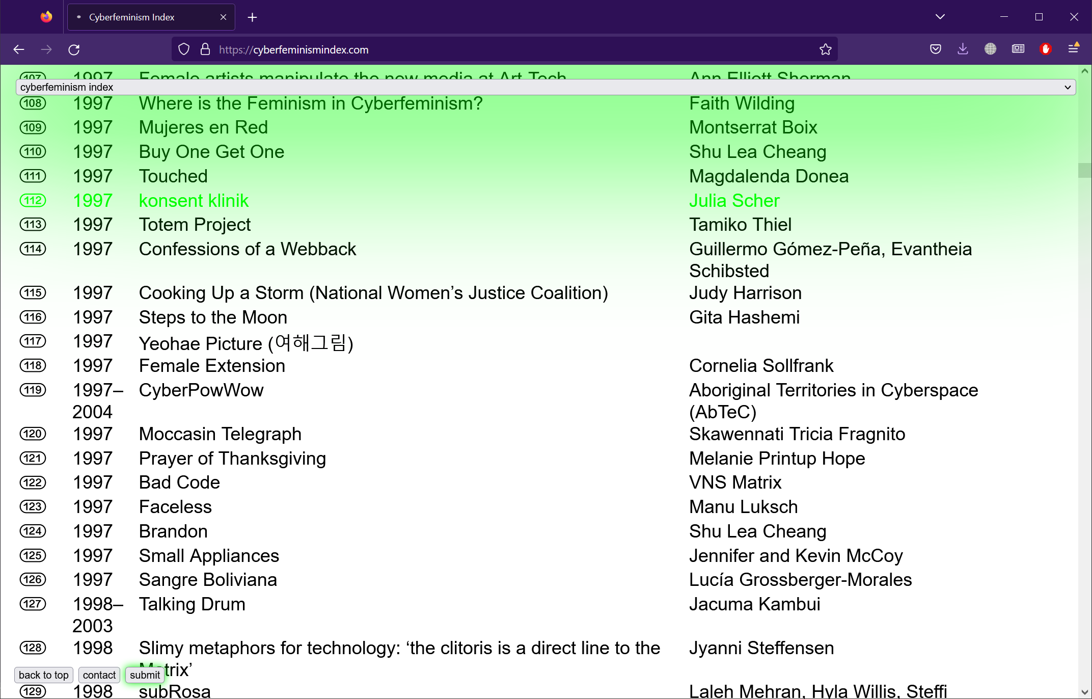 Hoejlund Marie. “Sharing as Survival : Mindy Seu on the Cyberfeminism Index”, The Gradient, 2020.