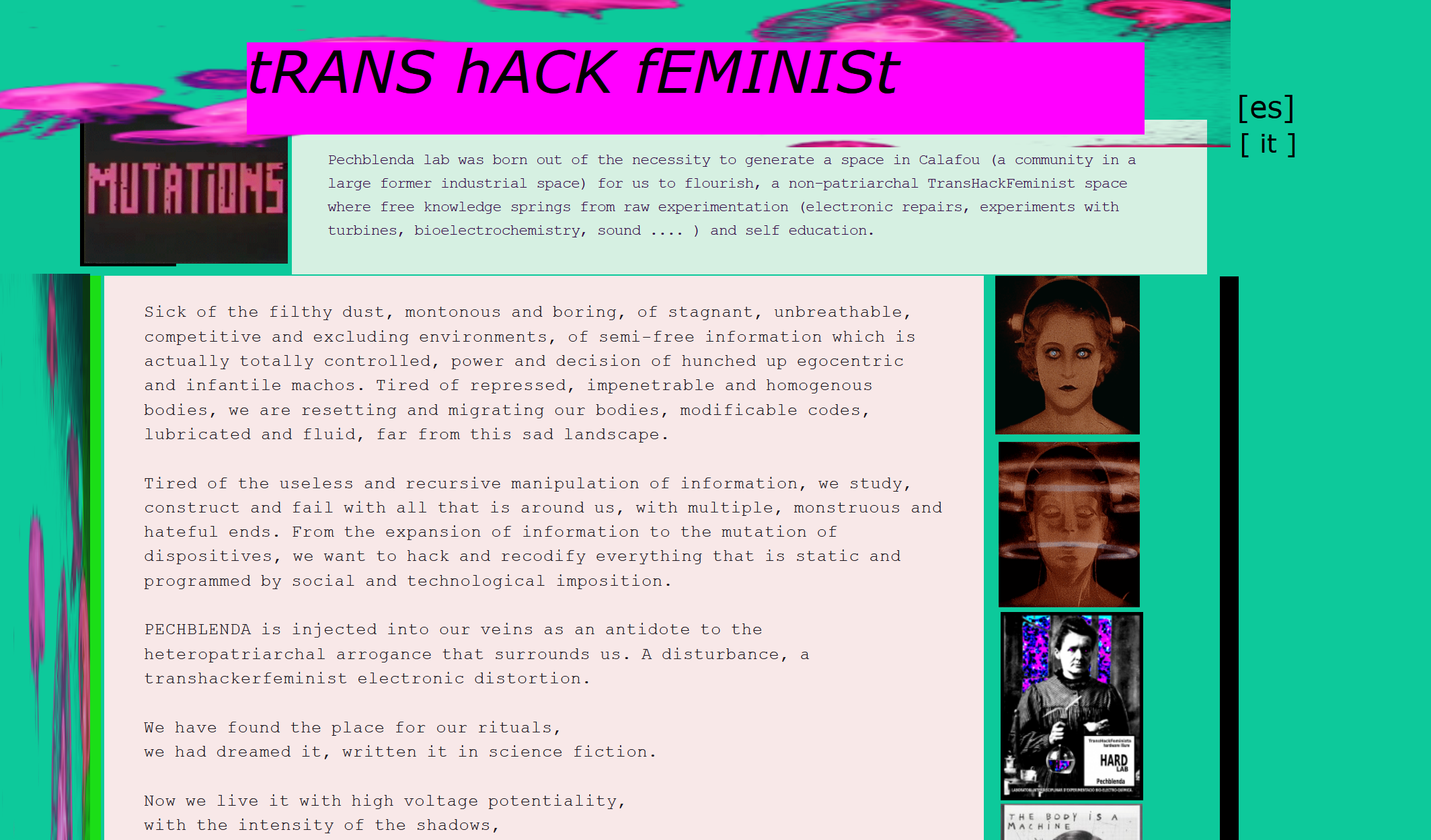 Elle est aussi à l’origine du laboratoire PechBlenda qui défend le mouvement transhackféministe en militant pour l’expérimentation à vif et l’éducation populaire. Les membres génèrent des contextes participatifs qui débouchent sur des performances, laboratoires, ateliers, rencontres, simples conversations. Le terme transhackféminisme n’a pas de définition propre, mais je le comprends comme l’addition de la dimension du genre au hacktivisme. Le hack y est un moyen de résistance, de transformation, générateur d’une pratique fluide, qui ne fait pas de différence entre théorie et pratique, qui interroge le rapport humain..e – plante – machine.